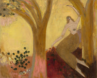 Brittany Ferns’ latest paintings begin with mermaids—sometimes alone, often in pairs—gliding through moonlit waters or resting under tangled trees. These duos suggest kinship, mystery, and quiet rebellion, suspended in dreamlike scenes that blur the lines between land and sea. Cowboys drift into the frame too, conjuring dry horizons and folklore of another kind. Together, these figures animate Ferns’ rich, layered landscapes, where deep greens and dusky tones evoke a wilderness that is both tender and untamed. Her worlds feel pulled from memory and myth, offering a space where stillness, longing, and wonder coexist.