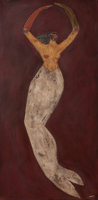 Brittany Ferns’ latest paintings begin with mermaids—sometimes alone, often in pairs—gliding through moonlit waters or resting under tangled trees. These duos suggest kinship, mystery, and quiet rebellion, suspended in dreamlike scenes that blur the lines between land and sea. Cowboys drift into the frame too, conjuring dry horizons and folklore of another kind. Together, these figures animate Ferns’ rich, layered landscapes, where deep greens and dusky tones evoke a wilderness that is both tender and untamed. Her worlds feel pulled from memory and myth, offering a space where stillness, longing, and wonder coexist.
