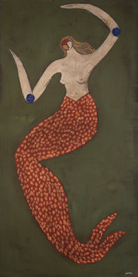 Brittany Ferns’ latest paintings begin with mermaids—sometimes alone, often in pairs—gliding through moonlit waters or resting under tangled trees. These duos suggest kinship, mystery, and quiet rebellion, suspended in dreamlike scenes that blur the lines between land and sea. Cowboys drift into the frame too, conjuring dry horizons and folklore of another kind. Together, these figures animate Ferns’ rich, layered landscapes, where deep greens and dusky tones evoke a wilderness that is both tender and untamed. Her worlds feel pulled from memory and myth, offering a space where stillness, longing, and wonder coexist.