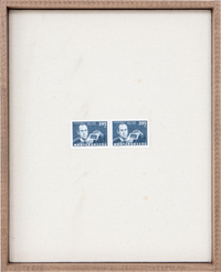 inherited stamps on canvas, walnut stain and brass brad frame
