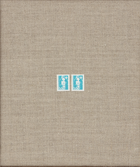 inherited stamps on linen, oak and brass brad frame