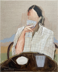 With a soft, muted palette and simplified forms, Abs invites interpretation, allowing each composition to serve as a fragment of a larger, unspoken story. The presence of men with cats introduces a subtle subversion of traditional masculinity, offering a quiet reflection on tenderness and introspection. Balancing structure and fluidity, pattern and movement, her paintings evoke a sense of poetic intimacy, where each viewer can find echoes of their own emotions and memories.