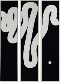 The work uses vanta black, which is the richest pigment of black, absorbing all light to appear as velvety fabric. The cream paint and the blonde frames, cuts through to give a high contrast effect.