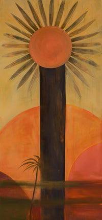 “Pindorama,” meaning “land of the palm trees,” is the name the Indigenous Tupi-Guarani people gave their homeland—long before it became Brazil. Miranda honors this history, drawing from the verses of Adélia Prado, the melodies of Tom Jobim, and the spirit of Brazil’s cultural tapestry. Each painting is an emotional landscape—bold, rhythmic, and alive—where orange is the sun’s embrace, light becomes movement, and every brushstroke echoes a distant song.
