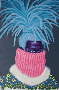 His goal for this series of paintings is to represent the glory and majesty in the variety of hair textures as well as to take a fresh look at historical and present-day stories on hair dressing as a symbol of status, social rank, and spirituality. The different colors of hair used across the series represent and acknowledge the different types of hair—whether they be straight, coily, red, or black. The faces of the participants in the work are not important: the viewer is forced to focus and engage with the crown.