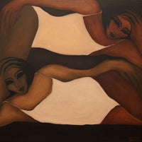 "Two dark figures rest in layered quiet, their bodies nestled together as if holding one collective dream. Their closed eyes suggest a suspension of time or a moment when energy softens and the world finally exhales. Asleep Under The Same Moon speaks to unity, to the belief that rest can be shared, and that protection sometimes looks like closeness."