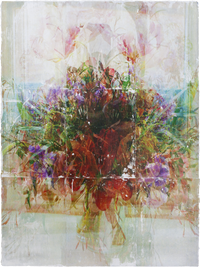 Jeff Kraus’s mixed media pigment compositions deconstruct the still life, reimagining the tradition of flower arrangement through a contemporary lens. Beginning with a quiet ritual—photographing flowers on a windowsill at home—Kraus transforms these images through a process that straddles the physical and the digital. Collaging, printing, and layering, he manipulates his compositions with both digital tools and tactile interventions, allowing the flowers to exist in multiple states at once: vibrant yet fleeting, arranged yet deconstructed. The result is a body of work that explores the tension between permanence and impermanence, presence and decay. By pushing the boundaries between natural and artificial, Kraus suspends moments in time, holding beauty at the precipice of its inevitable dissolution.