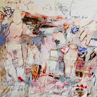 The large-scale “Carpet of Life II” is a vivid, associative collage of the artist's life, created through a dynamic and intuitive process. Human figures of varying sizes emerge across the canvas, coming and going like scenes in a film. These figures are woven into a tapestry of everyday life, dreams, and memories, forming a complex narrative. Scribblings and sketches further enrich this emotionally charged work, contributing to its raw, expressive power. As the title suggests, the painting assembles fragments of a lifetime, piecing together moments and memories in a puzzle-like composition. Executed in mixed media on raw, unstretched canvas, the work hangs like a tapestry, its unbound edges adding to the sense of an ongoing, unfinished story.