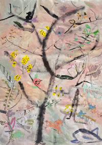 Emma Ortiz’s Mustard, Mt. Fuji, Cherry Blossom, Harajuku, Riding the Wave, and So Quiet in the Garden capture fleeting moments of wonder from her time in Japan. These works reimagine the shifting landscapes seen from the window of a Shinkansen train, the bare trees she instinctively adorned in her mind, and the hushed beauty of hidden gardens and quiet neighborhoods.
