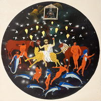 Umar Rashid continues his signature world-building—collapsing classical mythology, pop culture, and revisionist history into dense, irreverent tableaux that defy linear time. In this work, Rashid turns his focus to decadence, staging a raucous gathering presided over by a triumphant Dionysus. The god of wine and excess commands the scene with such gravitational pull that even Zeus—usually a symbol of divine order—has relinquished his authority, serenading the chaos below with a flute rather than a staff.