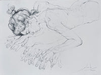 Lola Erhart’s fluid line drawings capture the rhythm and energy of the body in motion, translating movement into form with effortless precision. A former contemporary dancer, Erhart approaches drawing as an extension of physical expression—each stroke guided by intuition, presence, and the natural flow of gesture. Her figures, both dynamic and intimate, emerge from a deep connection between body and instinct, where spontaneity replaces rigid intention. The result is a series of compositions that feel both raw and refined, alive with the quiet urgency of motion and emotion.