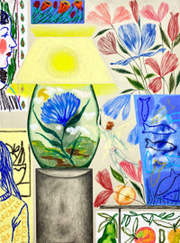 In Burke’s world, the home is not a container but a portal: walls breathe, objects glow, and the still life becomes anything but still. Botanical forms creep in through curtains or rise from the floor, while vessels and vases blur into terrain. This porousness—between inside and out, real and imagined—offers a meditation on permeability itself: how we absorb the world, how memory and nature root themselves in our daily surroundings. Through her alchemical use of color and enigmatic forms, Burke invites the viewer into a space where perception softens, and the familiar becomes mysteriously alive.