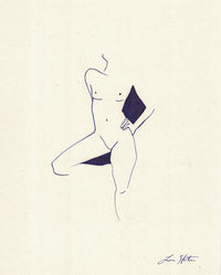 Lauren Skunta’s delicate cobalt ink figure drawings distill movement and emotion into their purest form. With fluid, gestural lines, she captures the essence of the human body—both grounded and ephemeral, familiar yet elusive. The deep cobalt ink lends a quiet intensity, its rich hue echoing the depth of expression within each figure.
