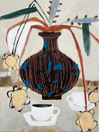 Threaded throughout the series are repeated dotted patterns, subtle gestures that introduce playfulness and hint at a deeper innocence. These marks act almost like petals themselves—scattered, intuitive, light-hearted. Within the bouquet of floral studies, four portraits offer a human counterpart to the blooming. Each woman, painted with quiet dignity, becomes a vessel for the emotional tenor of spring. In Florist, the emotional centerpiece of the show, Abs offers a portrait of calm resolve—of someone who arranges beauty not as a flourish, but as an act of strength.