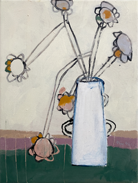 "In this series, I blend still lifes of flowers with figurative scenes to create a narrative aboutcloseness, emotions, and the transience of the moment. The vases with flowers symbolize bothfreshness and renewal, as well as the fragility of life. The figures–women, men, couples–embody various facets of love, longing, and security."