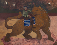 Kate Florence’s large-scale figurative paintings unfold like vignettes from a surreal Western dream. Her subjects—musicians, horses, cowboy-like figures—move through invented narratives rendered in rich earth tones and sweeping, gestural lines. These scenes hum with motion and intimacy, each stroke echoing the immediacy of the hand. Drawing from a personal mythology as much as from the collective imaginary of the American West, Florence constructs spaces where story and symbol collide. Her compositions, both raw and precise, carry the quiet charge of something familiar made strange—an interior frontier where emotion and myth meet in equal measure.
