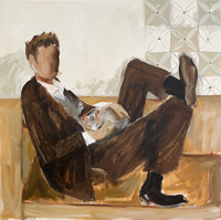 With a soft, muted palette and simplified forms, Abs invites interpretation, allowing each composition to serve as a fragment of a larger, unspoken story. The presence of men with cats introduces a subtle subversion of traditional masculinity, offering a quiet reflection on tenderness and introspection. Balancing structure and fluidity, pattern and movement, her paintings evoke a sense of poetic intimacy, where each viewer can find echoes of their own emotions and memories.