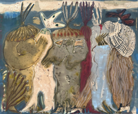 Coffee, ink, acrylic, charcoal, and oil stick on canvas