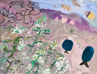 Emma Ortiz’s Mustard, Mt. Fuji, Cherry Blossom, Harajuku, Riding the Wave, and So Quiet in the Garden capture fleeting moments of wonder from her time in Japan. These works reimagine the shifting landscapes seen from the window of a Shinkansen train, the bare trees she instinctively adorned in her mind, and the hushed beauty of hidden gardens and quiet neighborhoods.