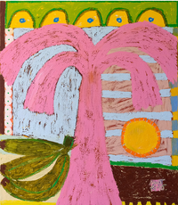 A recurring motif in Morito’s work is the palm tree—a symbol of longing, distance, and connection to a home that remains close in spirit despite physical separation. In her latest series, she revisits this theme with a fresh intensity, employing oil sticks to build rough, multi-layered surfaces that heighten the depth and emotion of her compositions.