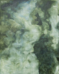 France's process is one of patience and surrender. Over weeks, she builds each work through staining, soaking, layering, and drying heavy raw canvas. Pigments seep and spread into organic forms, crystallizing into unique contours that echo geological surfaces — the grain of wood, the texture of cliff faces, desert ridges, or ocean foam. This marbled effect, consistent throughout France's body of work, mimics natural landforms as though seen from a great distance, while indistinct silhouettes emerge and fade, suggesting layered meanings and spiritual motifs.