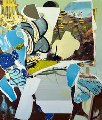 Michael Harnish’s paintings fuse abstraction and representation in a chaotic, exuberant harmony. Drawing from Southern California’s visual landscape—tropical plants, grocery store signage, skate culture, and 80s ephemera—Harnish creates layered compositions that feel both deeply personal and culturally omnivorous. Beginning with paper collages, his process embraces spontaneity and improvisation, evolving into paintings that are dense with color, gesture, and visual surprise.