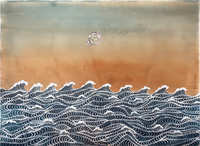 Lance’s continued series of watercolor paintings work with the sky to evolve the series forward while still using the repetitive and meditative elements from the original wave works. The sun's simple shapes add a minimal element to give the waves context, and the clouds have hidden faces in them, creating a dream-like character across the work.
