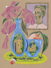 The Home Series was made at my drafting table, in the middle of my living room. After 32 years of hand-me-downs and curbside acquisitions, I finally invested in a real drafting table. What seemed like a minor shift in the orientation of my home proved, to be a lynchpin. Suddenly my apartment became a place of revery, rather than liminal space. With this newfound appreciation, I wanted to draw a series that basked in the potential of beautiful household moments. The subject matter is in keeping with past work (my love of flowers and fruit is unflinching), but with the addition of fairy creatures inhabiting the home. Each piece is a snapshot of beautiful chaos or satisfying indulgence, turning daily actives into magic.
