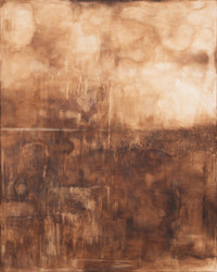 France's process is one of patience and surrender. Over weeks, she builds each work through staining, soaking, layering, and drying heavy raw canvas. Pigments seep and spread into organic forms, crystallizing into unique contours that echo geological surfaces — the grain of wood, the texture of cliff faces, desert ridges, or ocean foam. This marbled effect, consistent throughout France's body of work, mimics natural landforms as though seen from a great distance, while indistinct silhouettes emerge and fade, suggesting layered meanings and spiritual motifs.