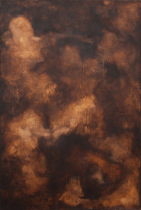 France's process is one of patience and surrender. Over weeks, she builds each work through staining, soaking, layering, and drying heavy raw canvas. Pigments seep and spread into organic forms, crystallizing into unique contours that echo geological surfaces — the grain of wood, the texture of cliff faces, desert ridges, or ocean foam. This marbled effect, consistent throughout France's body of work, mimics natural landforms as though seen from a great distance, while indistinct silhouettes emerge and fade, suggesting layered meanings and spiritual motifs.