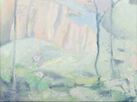 Ross’ palette, dominated by ethereal teals and greens, evokes nostalgia and otherworldliness. These recurring hues, reminiscent of oxidized patina on aged architecture, mirror cinema’s ability to transcend time. Through a process of layering, blending, and softening backgrounds against more insistent brushstrokes, Ross destabilizes familiar imagery, allowing ghostly echoes of the film to surface. Figures such as Dorothy may appear blurred, partially erased, or obscured, underscoring themes of fragility, repetition, and emotional dissociation. The result is a body of work that dissolves the boundaries between past and present, inviting viewers into a collective meditation on grief, memory, and healing.