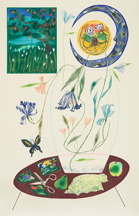Laura Burke’s Portals series speaks to many of the same motifs the artist has been drawn to in the past several years: plants, vessels, fruit, and people. In deteriorating the barrier between inside and outside, the series reflects her continued love and fascination with the world of inanimate objects and the secret lives she hopes they keep. Where this series deviates from previous works is in how the characters in Burke’s imaginary worlds begin to look back. Portals has recurring characters looking back at the viewer. The title of the series engages what pictures are — doorways into an invented world. No matter how familiar the subject matter may appear, each piece is an interpretation of our shared reality, and within that interpretation are windows and gateways to yet another invented world.