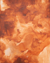 France's process is one of patience and surrender. Over weeks, she builds each work through staining, soaking, layering, and drying heavy raw canvas. Pigments seep and spread into organic forms, crystallizing into unique contours that echo geological surfaces — the grain of wood, the texture of cliff faces, desert ridges, or ocean foam. This marbled effect, consistent throughout France's body of work, mimics natural landforms as though seen from a great distance, while indistinct silhouettes emerge and fade, suggesting layered meanings and spiritual motifs.