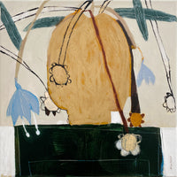 Threaded throughout the series are repeated dotted patterns, subtle gestures that introduce playfulness and hint at a deeper innocence. These marks act almost like petals themselves—scattered, intuitive, light-hearted. Within the bouquet of floral studies, four portraits offer a human counterpart to the blooming. Each woman, painted with quiet dignity, becomes a vessel for the emotional tenor of spring. In Florist, the emotional centerpiece of the show, Abs offers a portrait of calm resolve—of someone who arranges beauty not as a flourish, but as an act of strength.