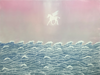 Lance’s continued series of watercolor paintings work with the sky to evolve the series forward while still using the repetitive and meditative elements from the original wave works. The sun's simple shapes add a minimal element to give the waves context, and the clouds have hidden faces in them, creating a dream-like character across the work.