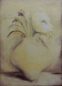 Yeon Kyung Park’s atmospheric still-life paintings come from Park’s desire to capture life’s overlooked moments. Inspired by quiet moments like the “feeling I felt in the moment of dawn”, Park aims to “express those daily short moments of peacefulness”. Park’s distinct painting style uses tone-on-tone color and a light hand to soften the paint gestures into dreamy, soft-edged forms – both representing an object and the abstract idea of a memory of a given moment.