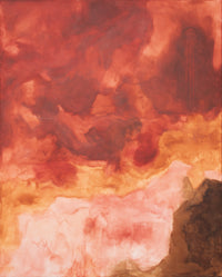 France's process is one of patience and surrender. Over weeks, she builds each work through staining, soaking, layering, and drying heavy raw canvas. Pigments seep and spread into organic forms, crystallizing into unique contours that echo geological surfaces — the grain of wood, the texture of cliff faces, desert ridges, or ocean foam. This marbled effect, consistent throughout France's body of work, mimics natural landforms as though seen from a great distance, while indistinct silhouettes emerge and fade, suggesting layered meanings and spiritual motifs.