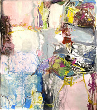 The oil on canvas work “Summer Talk” speaks of the feelings, memories, and thoughts that arise when we think of the summer season. The painting’s light composition seems as if we are looking into a summer garden from above. The green and the delicate pink/rosé tones form a contrast to lighter areas as the colors and shapes together create liveliness and lightness as we seem to feel the sun shining when we view the work.