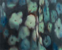 Ross’s palette—dominated by oxidized teals, seafoam greens, and iridescent washes—echoes the patina of aged film and weathered architecture, underscoring the tension between time’s erosion and cinema’s illusion of permanence. Starting from film stills projected onto canvas, she layers, blurs, and reconfigures her surfaces to push background into distance while pulling painterly gestures forward. The resulting images maintain a ghostly echo of their cinematic origins, yet are destabilized—figures blur, dissolve, or vanish, reflecting the fragility of memory and the instability of form.