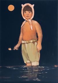 In Irinka Talakhadze’s new paintings, figures float weightlessly in water, suspended between memory and metaphor. These dreamlike scenes, drawn from personal family imagery, evoke the intimacy of childhood moments—carefree, tender, and tactile—while also conjuring a surreal, almost mythical atmosphere. The water becomes a threshold: both a literal setting of familial closeness and a symbolic space of transformation, vulnerability, and suspended time. In capturing the fluidity of childhood and memory, Talakhadze’s work invites us to linger in the in-between—where past and present, real and imagined, gently blur.