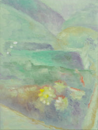 Ross’ palette, dominated by ethereal teals and greens, evokes nostalgia and otherworldliness. These recurring hues, reminiscent of oxidized patina on aged architecture, mirror cinema’s ability to transcend time. Through a process of layering, blending, and softening backgrounds against more insistent brushstrokes, Ross destabilizes familiar imagery, allowing ghostly echoes of the film to surface. Figures such as Dorothy may appear blurred, partially erased, or obscured, underscoring themes of fragility, repetition, and emotional dissociation. The result is a body of work that dissolves the boundaries between past and present, inviting viewers into a collective meditation on grief, memory, and healing.
