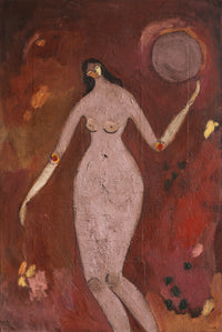 Brittany Ferns’ latest paintings begin with mermaids—sometimes alone, often in pairs—gliding through moonlit waters or resting under tangled trees. These duos suggest kinship, mystery, and quiet rebellion, suspended in dreamlike scenes that blur the lines between land and sea. Cowboys drift into the frame too, conjuring dry horizons and folklore of another kind. Together, these figures animate Ferns’ rich, layered landscapes, where deep greens and dusky tones evoke a wilderness that is both tender and untamed. Her worlds feel pulled from memory and myth, offering a space where stillness, longing, and wonder coexist.