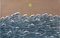 Lance’s creative process itself mirrors meditation—methodical and repetitive—each wave she paints becoming a testament to the mindfulness required in her craft. With watercolors, she continues to expand this series, introducing the sky as a counterpart to the sea. The sun, reduced to its most minimal, hovers above like a calm sentinel, while clouds with hidden faces drift through the compositions, adding a quiet, dreamlike quality. The interplay between these elements feels effortless, yet deeply intentional, creating a sense of harmony that transcends the visual. Like the ocean itself, Waves pulls the viewer into its depths, inviting reflection in the same slow, steady cadence that inspired its creation.