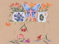 The Home Series was made at my drafting table, in the middle of my living room. After 32 years of hand-me-downs and curbside acquisitions, I finally invested in a real drafting table. What seemed like a minor shift in the orientation of my home proved, to be a lynchpin. Suddenly my apartment became a place of revery, rather than liminal space. With this newfound appreciation, I wanted to draw a series that basked in the potential of beautiful household moments. The subject matter is in keeping with past work (my love of flowers and fruit is unflinching), but with the addition of fairy creatures inhabiting the home. Each piece is a snapshot of beautiful chaos or satisfying indulgence, turning daily actives into magic.