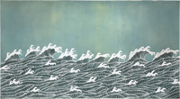 As the series evolves, Lance introduces new visual elements that extend the metaphor beyond the sea. Skies, suns, and cloud forms—rendered in a minimalist, almost symbolic vocabulary—interact with the painted waves in a harmonious balance. The sun, reduced to a gentle orb, anchors the composition, while soft-edged clouds, sometimes containing the suggestion of faces, drift through like quiet thoughts or passing emotions. These elements combine to create atmospheric scenes that feel timeless and contemplative. Waves is more than a series of seascapes—it is an invitation to pause, breathe, and be carried by the slow, immersive cadence of nature and the self.
