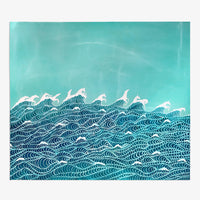 As the series evolves, Lance introduces new visual elements that extend the metaphor beyond the sea. Skies, suns, and cloud forms—rendered in a minimalist, almost symbolic vocabulary—interact with the painted waves in a harmonious balance. The sun, reduced to a gentle orb, anchors the composition, while soft-edged clouds, sometimes containing the suggestion of faces, drift through like quiet thoughts or passing emotions. These elements combine to create atmospheric scenes that feel timeless and contemplative. Waves is more than a series of seascapes—it is an invitation to pause, breathe, and be carried by the slow, immersive cadence of nature and the self.
