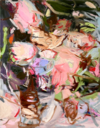 As the titles suggest, “Venus’ Garden II” and “Venus’ Garden VII” celebrate Venus in her garden as she takes a holiday from her duties as a goddess and now does what she wants. She melts with the plants in her garden. The dynamic, expressive brushstrokes and movements bring rhythm into this work.