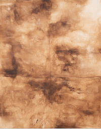 France's process is one of patience and surrender. Over weeks, she builds each work through staining, soaking, layering, and drying heavy raw canvas. Pigments seep and spread into organic forms, crystallizing into unique contours that echo geological surfaces — the grain of wood, the texture of cliff faces, desert ridges, or ocean foam. This marbled effect, consistent throughout France's body of work, mimics natural landforms as though seen from a great distance, while indistinct silhouettes emerge and fade, suggesting layered meanings and spiritual motifs.