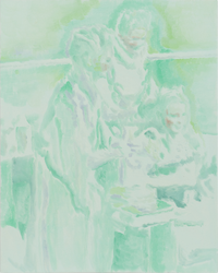 Ross’s palette—dominated by oxidized teals, seafoam greens, and iridescent washes—echoes the patina of aged film and weathered architecture, underscoring the tension between time’s erosion and cinema’s illusion of permanence. Starting from film stills projected onto canvas, she layers, blurs, and reconfigures her surfaces to push background into distance while pulling painterly gestures forward. The resulting images maintain a ghostly echo of their cinematic origins, yet are destabilized—figures blur, dissolve, or vanish, reflecting the fragility of memory and the instability of form.