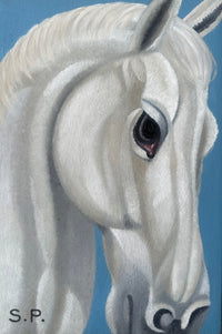 Though modest in scale, each painting feels monumental in mood. The horses often appear alone, set against simplified backdrops that highlight their form and bearing. Whether still or mid-stride, they evoke a timeless connection between artist and animal, vulnerability and resilience. Through these small yet potent works, Polmo continues his exploration of presence—this time through creatures that mirror both freedom and quiet nobility.